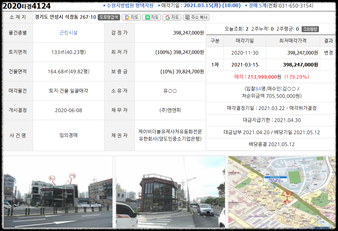 안성의 한경대 맞은편 상가건물로 4억정도의 감정가에 7억이상의 낙찰가를 가져온 물건입니다. 위치적인 이점으로 경쟁이 아주 높았습니다.